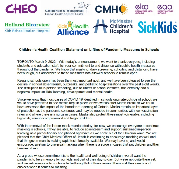 Both the Children's Health Coalition (including SickKids Hospital) and the Science Table strongly argued against removing masks at this time, hoping we could wait at least until mid-April with a careful eye on wastewater data.